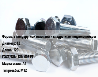 Болт с полукруглой головкой и квадратным подголовником 12х120 DIN 603 FT Сталь: А4 М12, цену уточнять, кг цена от 157.08 ₽ / кг, где купить, условия доставки в Волгограде и Волгоградской области