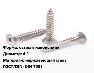 Саморез острый наконечник D=4.2 нержавеющая сталь ГОСТ: DIN 7981