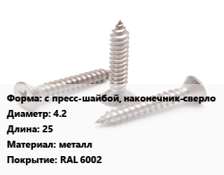 Саморез с пресс-шайбой, наконечник-сверло D=4.2 L=25 металл RAL 6002, упаковка 1000 шт цена от 803.72 ₽ / кг, где купить, условия доставки в Волгограде и Волгоградской области
