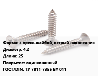 Саморез с пресс-шайбой, острый наконечник D=4.2 L=25 оцинкованный ГОСТ: ТУ 7811-7355 BY 011