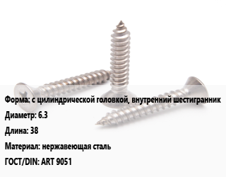 Саморез с цилиндрической головкой, внутренний шестигранник D=6.3 L=38 нержавеющая сталь ГОСТ: ART 9051