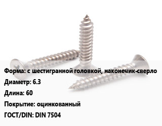 Саморез с шестигранной головкой, наконечик-сверло D=6.3 L=60 оцинкованный ГОСТ: DIN 7504, шт цена от 8.03 ₽ / кг, где купить, условия доставки в Волгограде и Волгоградской области