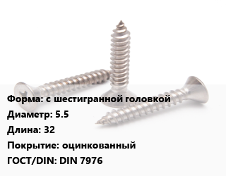 Саморез с шестигранной головкой D=5.5 L=32 оцинкованный ГОСТ: DIN 7976
