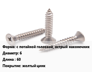 Саморез с потайной головкой, острый наконечник D=6 L=60 желтый цинк, шт цена от 4.07 ₽ / кг, где купить, условия доставки в Волгограде и Волгоградской области