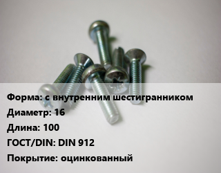 Винт с внутренним шестигранником 16х100 DIN 912 оцинкованный, 10.9,12.9,8.8, Китай,цена за шт, кг цена от 238.31 ₽ / кг, где купить, условия доставки в Волгограде и Волгоградской области