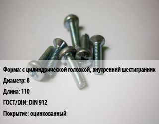 Винт с цилиндрической головкой, внутренний шестигранник 8х110 DIN 912 оцинкованный, 8.8, цена за 1000 шт, кг цена от 113.94 ₽ / кг, где купить, условия доставки в Волгограде и Волгоградской области