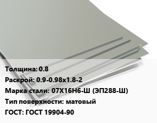 Лист нержавеющий 0.8 0.9-0.98х1.8-2 Сталь: 07Х16Н6-Ш (ЭП288-Ш) Тип:матовый ГОСТ 19904-90