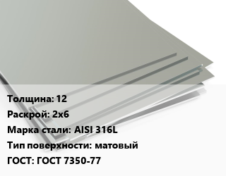 Лист нержавеющий 12 2х6 Сталь: AISI 316L Тип:матовый ГОСТ 7350-77, по запросу цена от 451 280 ₽ / т, где купить, условия доставки в Волгограде и Волгоградской области